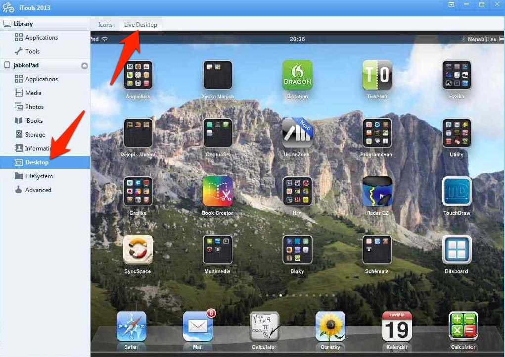Jedná se o utilitu iTools, která slouží zejména ke správě obsahu všech iZařízení. Pomocí iTools získáte přístup k souborům v iPadu (samozřejmě v rámci omezení iOS), k uloženým kontaktům, aplikacím, obrázkům atp. Jednou z funkcí je také možnost zpřístupnit dvěma způsoby plochu iPadu. První variantou je přístup k uspořádání ikon na ploše. Můžete si dokonce rozložení zazálohovat či využít „chytrého“ rozdělení do složek (nenašel jsem ale odvahu vyzkoušet to na svém iPadu :-)).